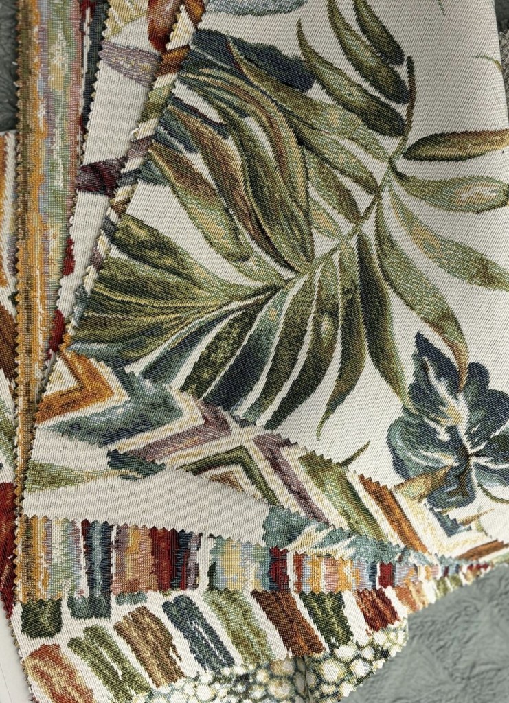 Fabric with printed natural designs that never go out of style adds style and elegance to any space. Its composition includes: 40% polyester / 10% acrylic / 40% cotton, 280 cm wide, Martindale 25,000 cycles.